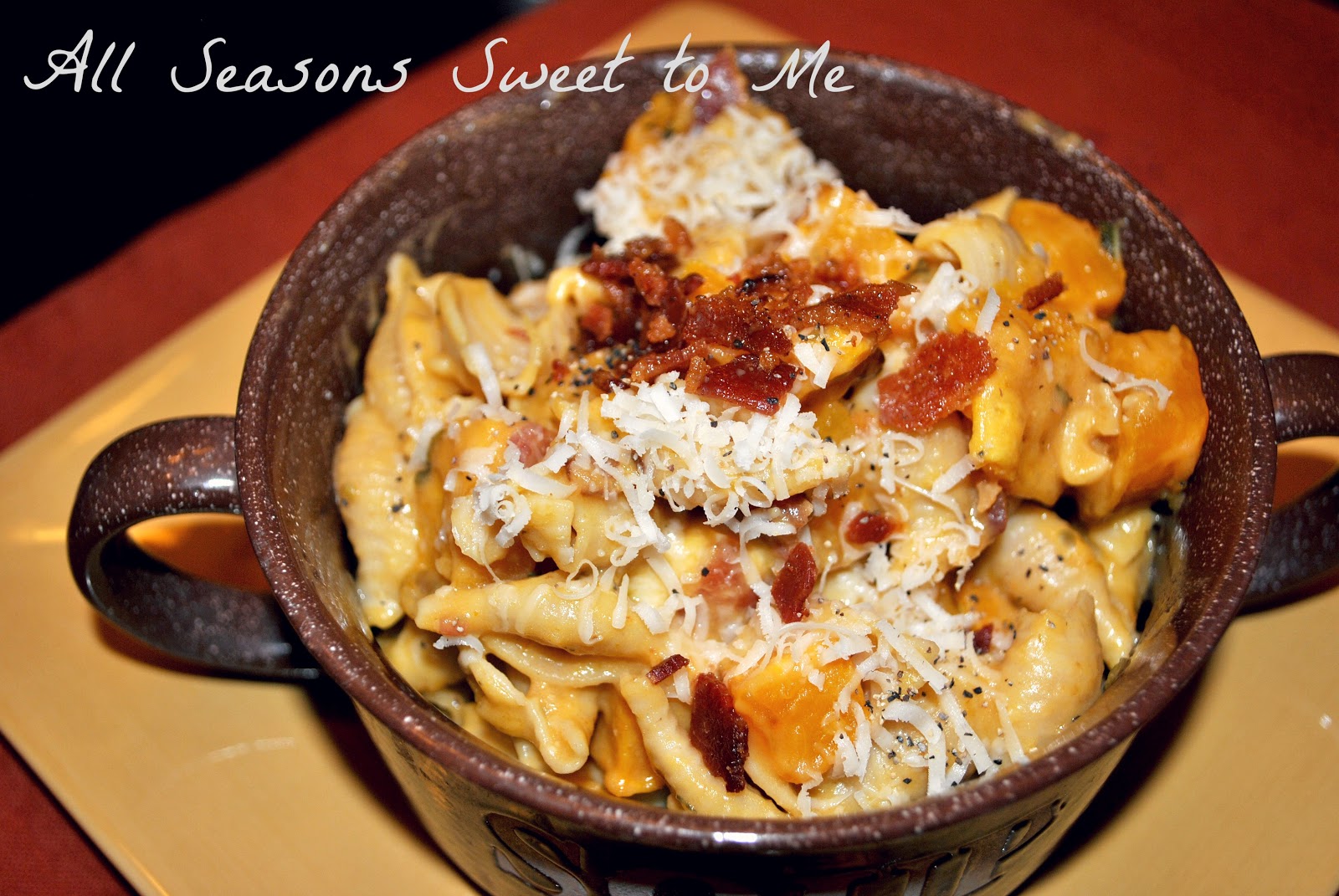 5. Drain pasta and return to stockpot. Add sauce, squash mixture, and crumbled bacon and toss to combine. Serve immediately or transfer to a casserole dish, top with additional Parmesan cheese, and bake 15–20 minutes.
